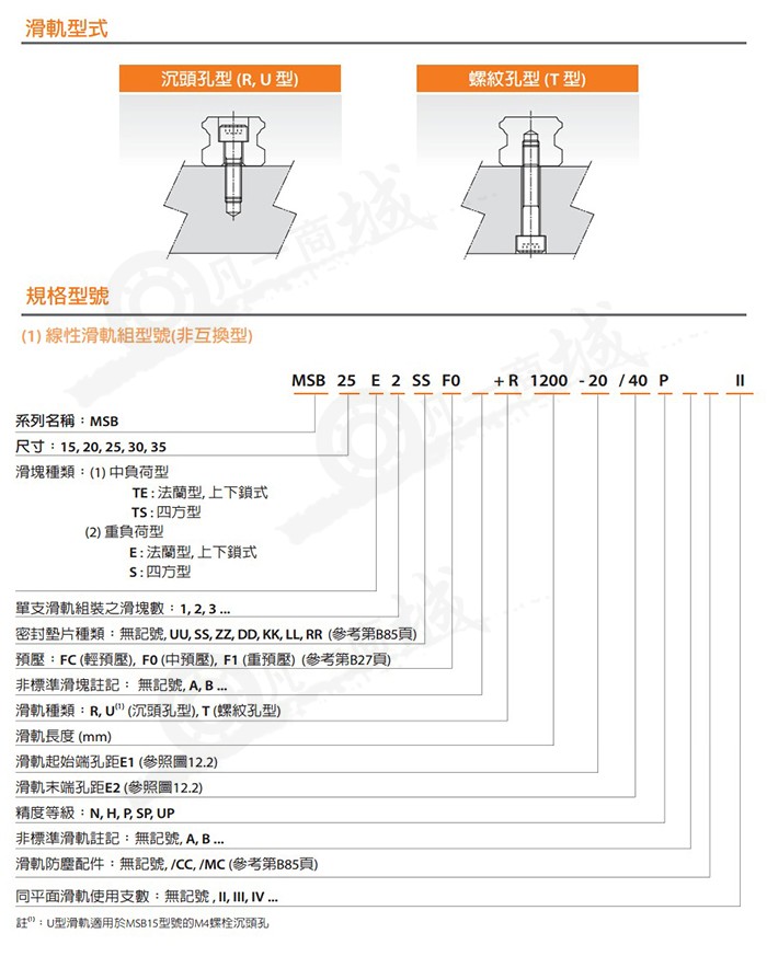 MSB 系列直線導軌采用4列圓弧接觸式及45°觸角的鋼珠列設計,提供徑向、反徑向及橫方向四方向的相同額定負荷能力,無論X、Y、Z等軸的各種安裝方式都可以使用,并且可在維持低摩擦阻力情況下均勻的施以預壓,增強四個受力方向的剛性,特別適合高精度與高負荷的運動方式。